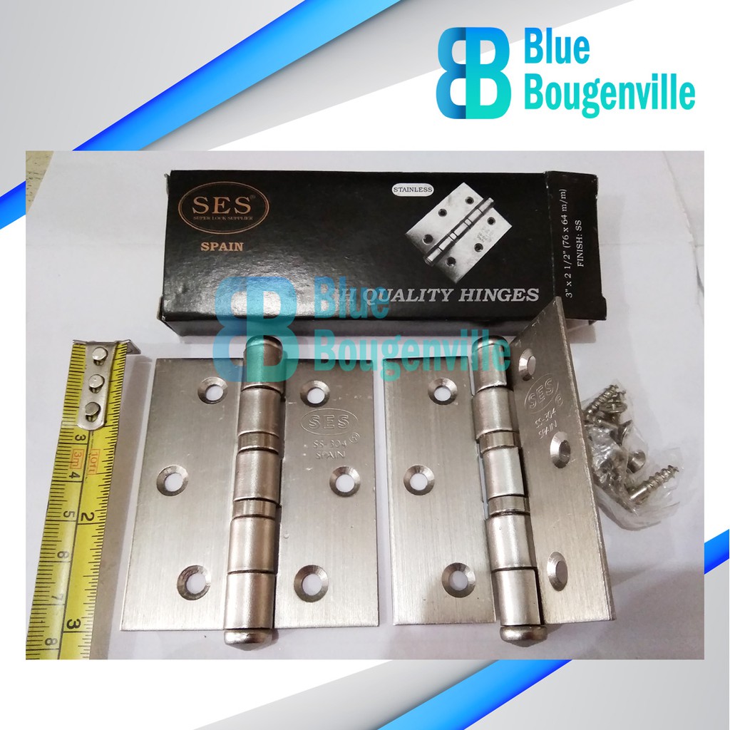 Engsel merk : SES.Ukuran :3inch x 2,5" x 2,0 mm.(Panjang 7,5 cm x lebar 3cm x tebal 2mm).Isi :1pasang (2buah), lengkap dengan sekrup.Warna : silver#engsel #engseljendela #engselpintu #jendela #pintu #ses #engselses #hinge #windowhinge #window #door #door