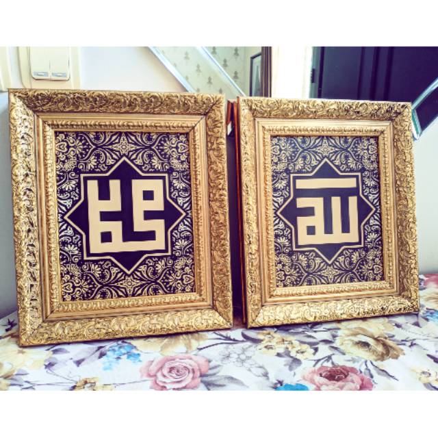 hiasan dinding lukisan kaligrafi allah muhammad kufi black gold ukir uk dengan bingkai