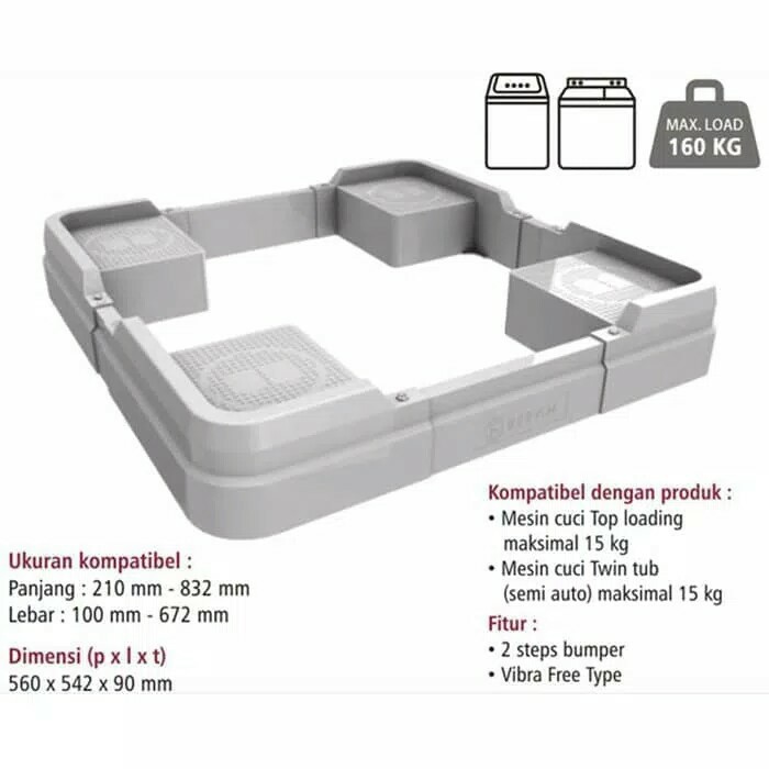 Dimensi yang bisa diatur sesuai dengan besar Kulkas atau Mesin cuci anda.Brand : BervinTipe : BOS-120Fungsi : Dudukan Mesin Cuci kapasitas 15kg (max)Beban : 160 kg (max)Multi Dimensi (sesuai kebutuhan)2 Step Bumper (body kuat bertulang)Vibra Free Type (karet bebas getaran)Adjustable Model (dapat disetel ukurannya)Color : GrayProduct Compatibility :- Twin Tub Washer / Mesiin Cuci twin tub (Semi Automatic) Max. 15 kg- Top Load Washer / Mesin cuci top load Max. 15 kgCompatibility Size :- Length : 21 - 83.2 cm- Width : 11 - 67.2 cm siap ,bisa langsung dipesan boss , agar segera kami p