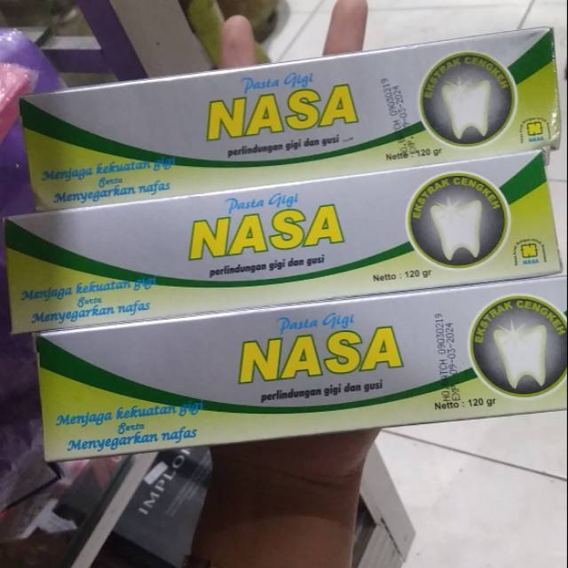 Pasta Gigi NASA merupakan pasta gigi herbal yang mengandung minyak aroma alami yang memiliki rasa dan bau yang segar. Kandungan minyak alami tersebut yang membuat mulut menjadi lebih harum dan dapat menghilangkan bau tidak sedap. Pasta gigi NASA merupakan produk rumah tangga dari PT Natural Nusantara yang terbuat dari bahan-bahan herbal 100% alami. Diformulasikan khusus untuk menjaga kesehatan gigi dan mengatasi masalah pada gigi, gusi dan mulut. Pasta Gigi NASA berguna untuk membersihkan gigi, membuat gigi tampak lebih putih, dapat menyehatkan gigi dan gusi. Bahan-bahan alami yang terkandung di dalamnya yaitu clorida, anti bacterial acids, sodium bicarbonate, pottasium, silika, flouride, vitamin C, sulfur, salvadorine, trimethyl amine, tannins, dan mineral-mineral lainnya. Anti bacterial acid yang terkandung dalam Pasta Gigi NASA ini berfungsi sebagai pembunuh bakteri, mencegah infeksi, hingga menghentikan pendarahan pada gusi. Anti decay agent atau zat anti pembusukan dalam Pasta Gigi NASA dapat menurunkan jumlah bakteri di mulut dan mencegah proses pembusukan. Komposisi : Water Calcium carbonate Sodium carboxymethyl cellulose Sodium lauryl sulphate Silica Sodium monofluorophospate Titanium dioxide Sodium sacharine Flavour Clove oil Methyl paraben pasta gigi nasa Manfaat Pasta Gigi NASA Mengandung anti bacterial untuk membunuh bakteri dalam mulut, mencegah pendarahan pada gusi, dan mencegah infeksi. Kalium pada pasta gigi membantu menjaga gigi tetap kuat sehingga Anda dengan mudah menggigit dan memakan makanan. Mineral pada pasta gigi membantu untuk membersihkan gigi, memutihkan gigi, dan menjaga kesehatan gigi. Vitamin C pada pasta gigi bermanfaat untuk mencegah sariawan, bibir kering, dan pendaharan pada mulut. Sedangkan clove oil yang terkandung dalam pasta gigi dapat membantu mengurangi bau mulut yang tidak sedap, sehingga Anda akan tampil lebih percaya diri. Anda juga menjadi nyaman untuk berkomunikasi dengan siapapun tanpa harus merasa khawatir akan bau mulut akibat pembusukan makanan oleh bakteri di dalam mulut. Flouride dapat menguatkan gigi dan mencegah timbulnya gusi berdarah akibat serangan dari bakteri dan kuman di dalam mulut. Dapat menjaga lapisan email gigi Mampu mencegah gigi berlubang Dapat menyembuhkan dan mencegah sakit gigi Terbuat dari bahan-bahan alami cocok untuk gigi sensisitf Sasaran : Dapat digunakan untuk semua usia, dari anak-anak hingga dewasa, dapat digunakan untuk semua anggota keluarga. Perizinan : Telah mendapat ijin resmi edar dengan nomor NA. 18141400016 Pasta Gigi Nasa Herbal Cara Pemakaian Pasta Gigi NASA Sebaiknya lakukan gosok gigi minimal 2 kali sehari, yaitu setelah sarapan pagi dan malam sebelum tidur Untuk mendapatkan hasil terbaik, gunakan pasta sepanjang bulu sikat (untuk orang dewasa). Dan gunakan pasta ¼ bulu sikat untuk anak-