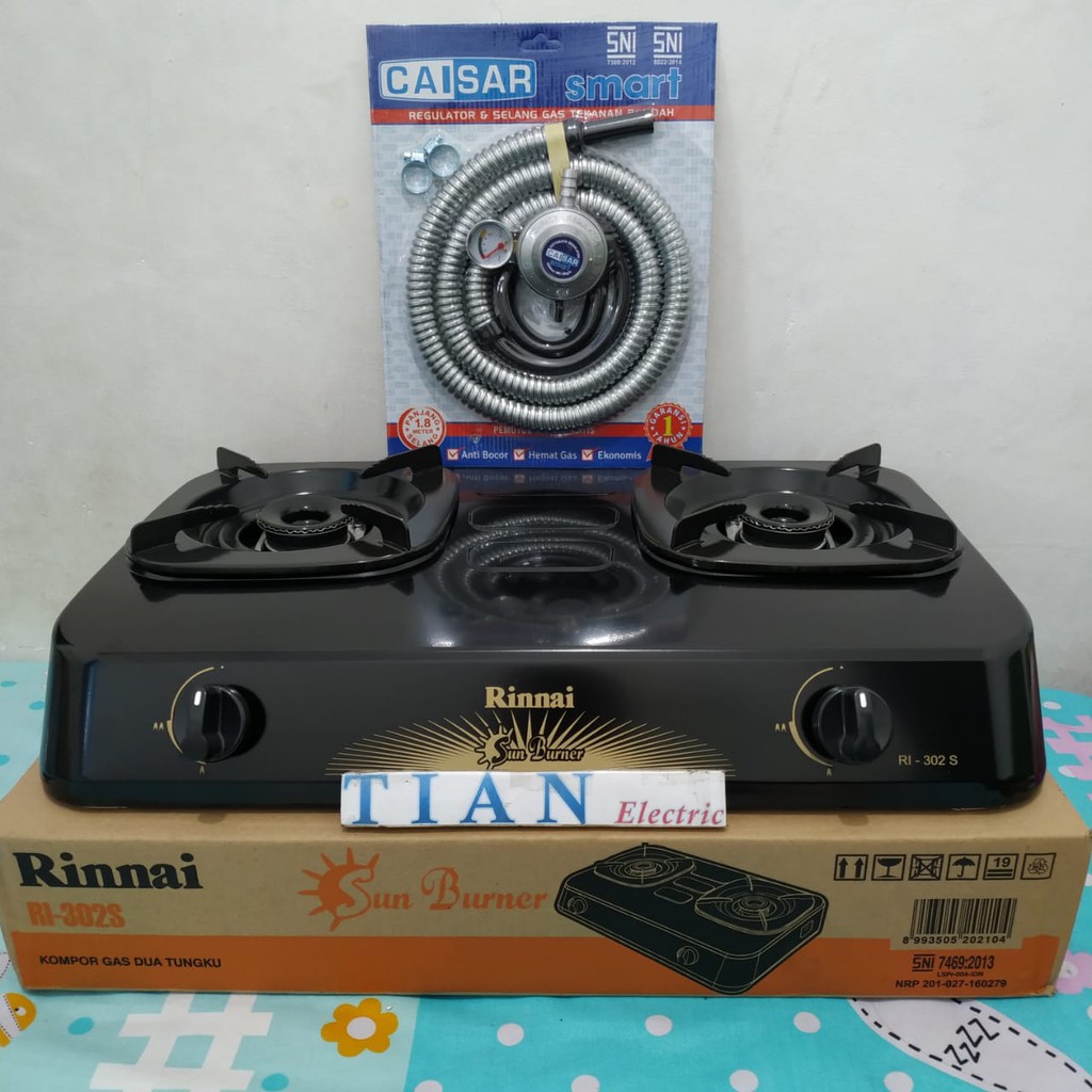 Rinnai Kompor Gas 2 Tungku - RI302S dikenal sebagai "Si api super hemat" karena pemakaian gas lebih hemat 20% daripada yang lain. Secara pastinya, masak sebentar maupun lebih lama sama-sama hemat gas. Desainnya ialah one press body dapat digunakan untuk panci yang berukuran 28 cm. Body yang kuat dapat menahan beban hingga 40 kg. Pilihan ideal untuk ibu rumah tangga maupun pelaku bisnis di rumah makan.Garansi 1 Tahun untuk Spare PartGaransi 3 Tahun untuk ServiceGaransi 5 Tahun untuk Katup GasRinnai Kompor Gas 2 Tungku ''" RI302S merupakan salah satu seri dari Rinnai ceramic burner series. Sisi eksterior yang berkelas dan gahar membuat interior pantry kian menawan. Kompor gas dengan features berupa sun burner atau si api hemat ini mampu menghemat gas hingga 20%. Selain itu, ramah lingkungan karena hasil sisa pembakaran dari CO-nya relatif kecil. Tangguh dan kokoh di setiap pemakaian karena masing-masing tungku bisa menahan beban hingga 20 Kg.Features :SUN BURNER ''" Si Api HematEfisiensi tinggi ''" pemakaian gas dapat hemat hingga 20 % dibandingkan dengan burner konvensionalRamah terhadap lingkungan dan baik untuk kesehatan keluarga ''" sisa hasil pembakaran CO rendah sebesar 0.0052% ( standar 0.14% )COMPACT BODY ''" Body yang KompakMenggabungkan kekuatandan kapasitas body yang kompakKekuatan : Konstruksi body kokoh ( One Pressed Body ) sehingga setiap tungku dapat menahan beban berat 20 kgKapasitas : Nyaman memasak dengan 2 panci berdiameter 28 cmSPECIFICATIONSModel RI302SDimensi (W x L x H) 60 x 36.5 x 14 cmGas Consumption (Kw) 1.9 ''" 1.9Sudah termasuk selang paket merk Caisar/MLS tergantung stok yg
