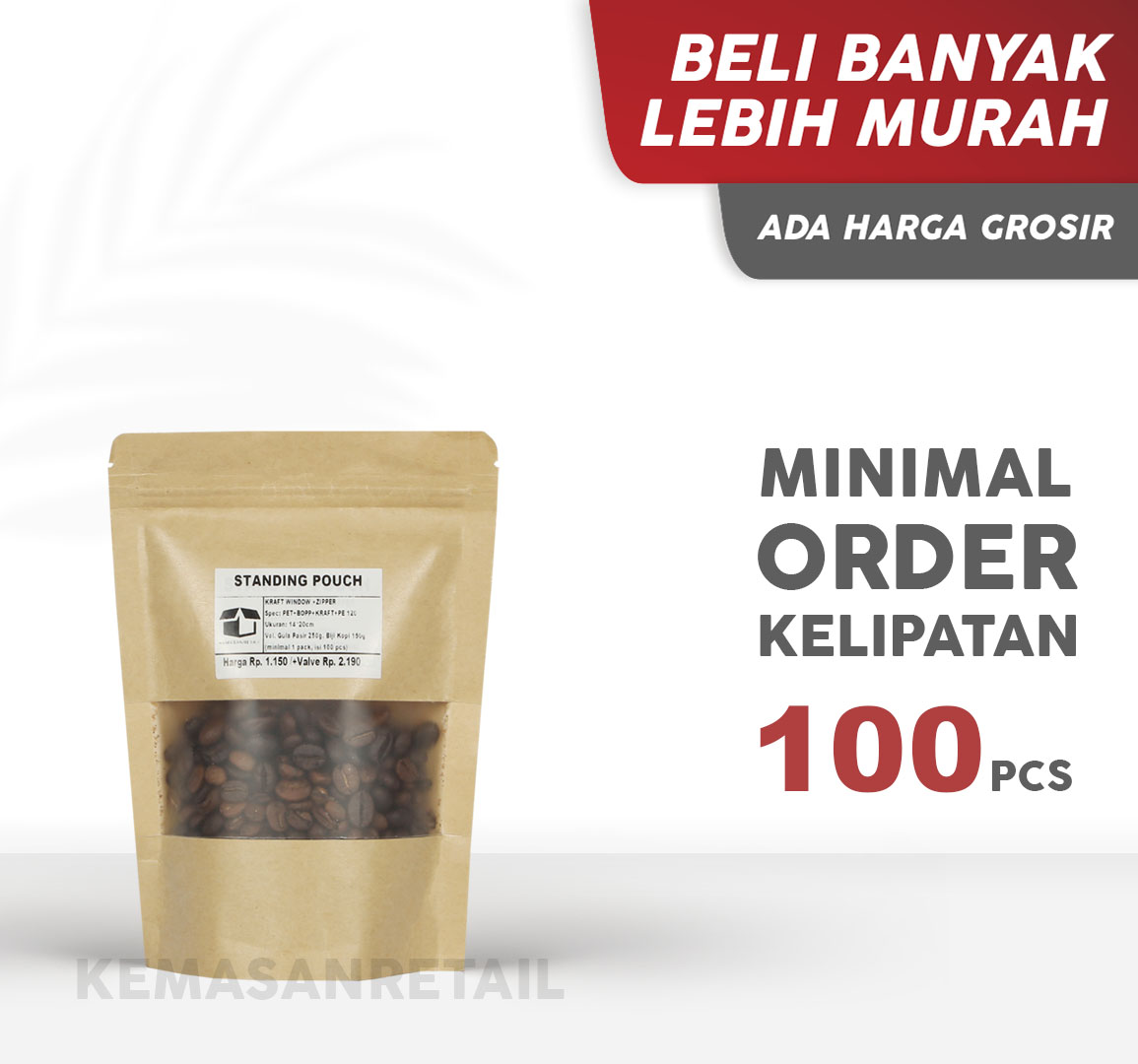 MOHON DI PERHATIKAN:MINIMUM ORDER:KELIPATAN 100 PCSSpesifikasi Produk:Jenis = Stand Up Pouch / Standing PouchIsi = 100 pcs/packSpec: PET/BOPP/KRAFT/PEKetebalan: 120ยต (microns)Food Grade materials.Tersedia berbagai jenis ukuran:- 12cm x 20cm (untuk acuan gula pasir 150g, acuan kopi 100g)- 14cm x 20cm (untuk acuan gula pasir 250g, acuan kopi 150g)- 15cm x 22cm (untuk acuan gula pasir 500g, acuan kopi 250g)- 16cm x 25cm (untuk acuan gula pasir 700g, acuan kopi 300g)- 18cm x 26cm (untuk acuan gula pasir 1000g, acuan kopi 500g)- 20cm x 30cm (untuk acuan gula pasir 2000g, acuan kopi 1000g)Note:- Barang yang sudah di beli tidak dapat di kembalikan atau ditukar. Mohon untukdi pastikan ukuran yang anda pilihTerima kasih telah berbelanja di toko kami.“From KJG With